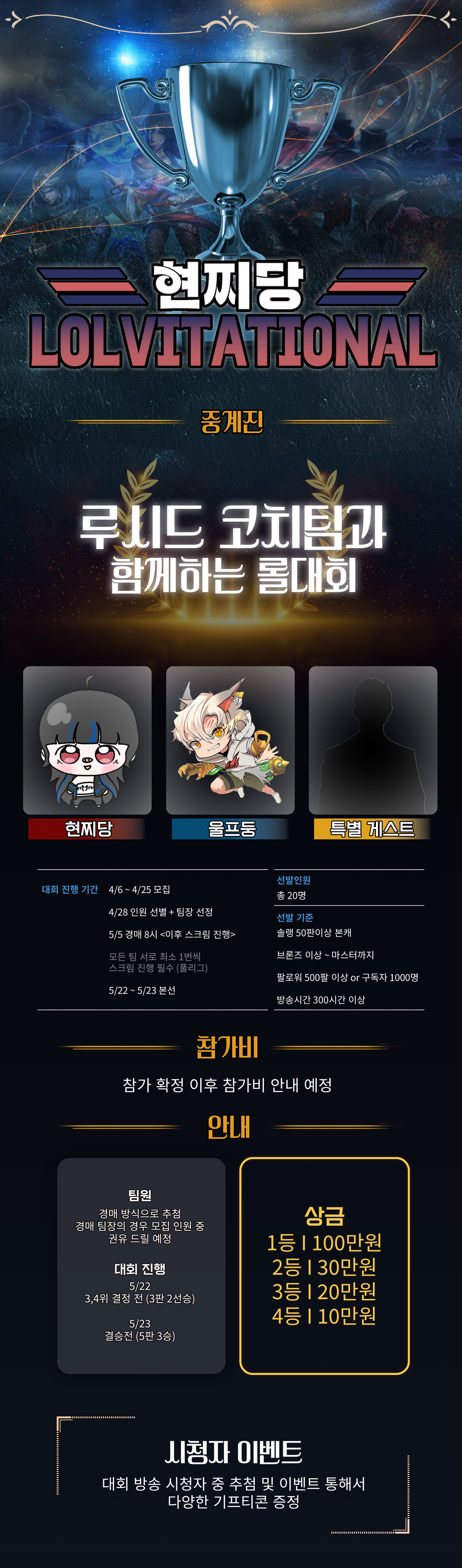 제가 이번에 '현찌당 LOVITATIONAL' 롤 스트리머 대회를 열게 되었습니다.