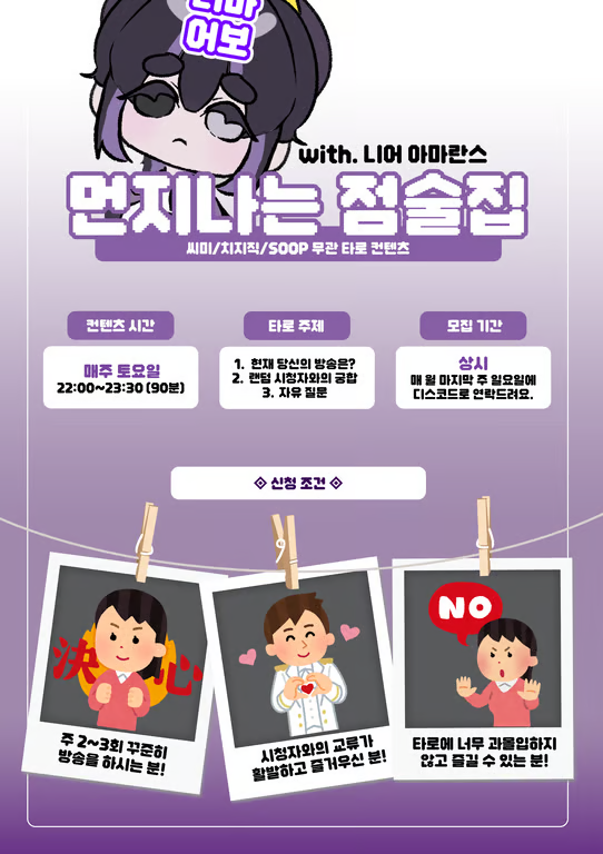 안녕하세요, 씨미에서 활동하는 니어 아마란스입니다. 해당 컨텐츠의 경우 2026년 5월부터 정기적으로 진행할 '먼지 핀 점술집'으로, 내용을 꼼꼼히 읽고 신청해주시면 감사하겠습니다. (네이버 폼: https://naver.me/5MvUJmLq)