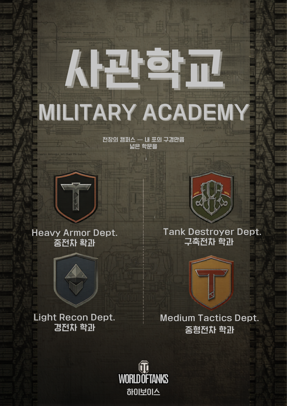 본 콘텐츠는 기존의 딱딱한 군사 훈련소 이미지가 아닌, 전차 전문 교육 기관이라는 콘셉트로 운영된다. 플레이어는 사관생도로 입학하여 자신의 플레이 스타일과 관심에 따라 학과를 선택하고, 각 학과별 전문 커리큘럼을 이수하며 점진적으로 성장하게 된다.