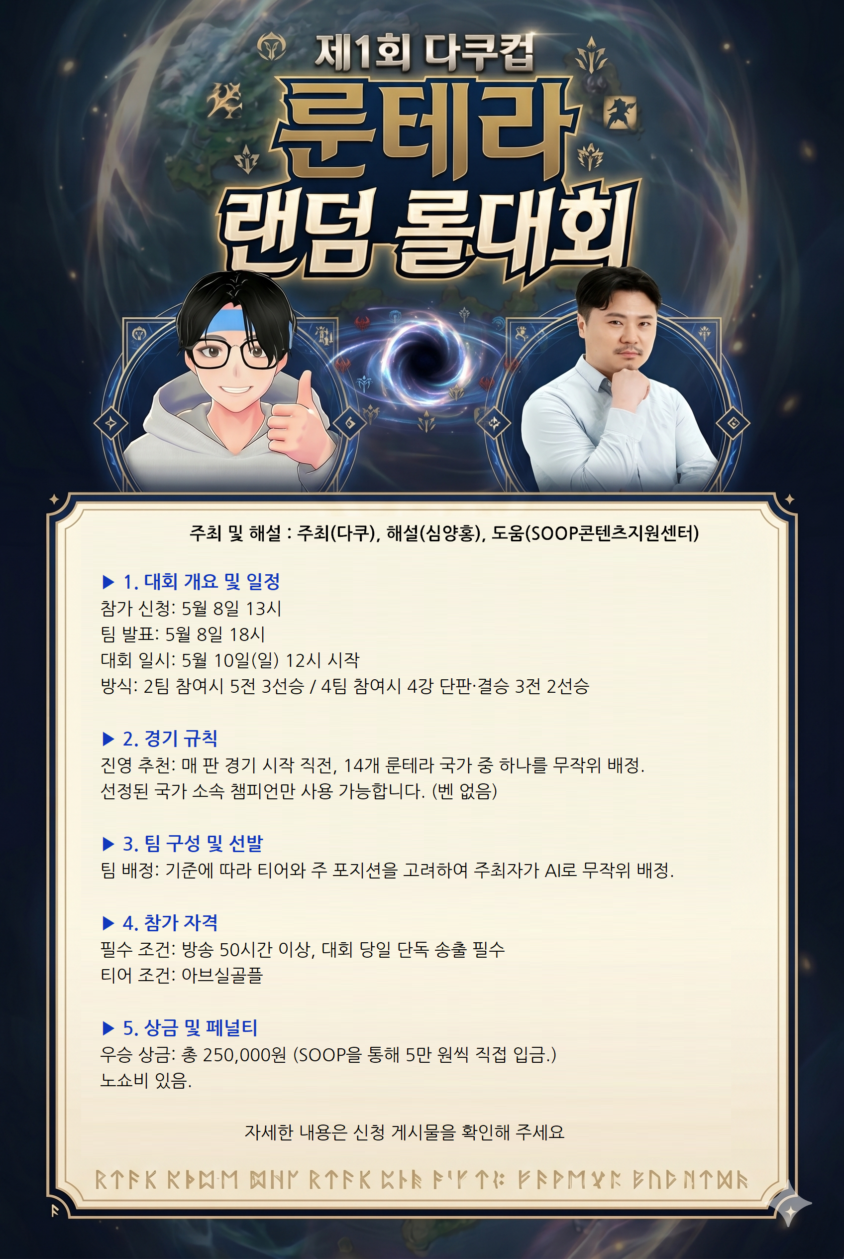 · 팀 배정: 티어와 주 포지션을 고려하여 주최자가 AI로 무작위로 팀을 배정합니다. (대회일 문제가 있을시 주최자 경기 참여할 수 있음)
