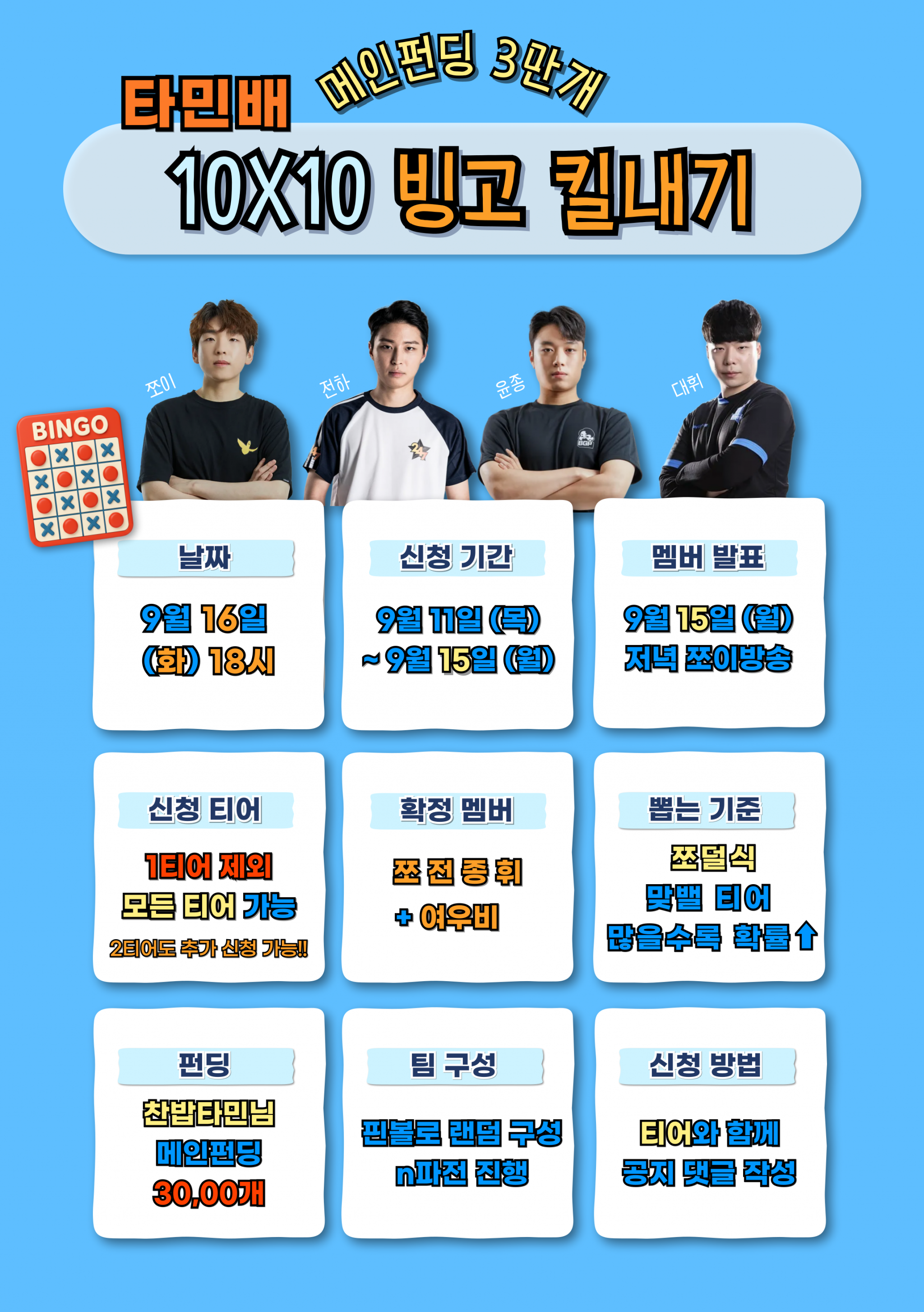 [타민배] 메인펀딩 30000개 100빙고 킬내기 신청받습니다쪼쪼이.신청하러 가기 입장료 : 3000개 (더 받아오셔두됨)<룰>치킨시 즉시 번호 지우기 (치킨시 생존 팀원 수 만큼 칸 지울수있음) <팀> 랜덤 대결이 파기전에 팀 맘에 안 들면 유료 리셋가능 (쪼이한테 300개)1인 리셋 3회제한 진짜 더 리셋하고싶으면 1000개<동률기준>칸수 > 줄 > 치킨다 똑같으면 팀전 윷놀이빵 찐텐금지 뻐꾹이 부탁드림다