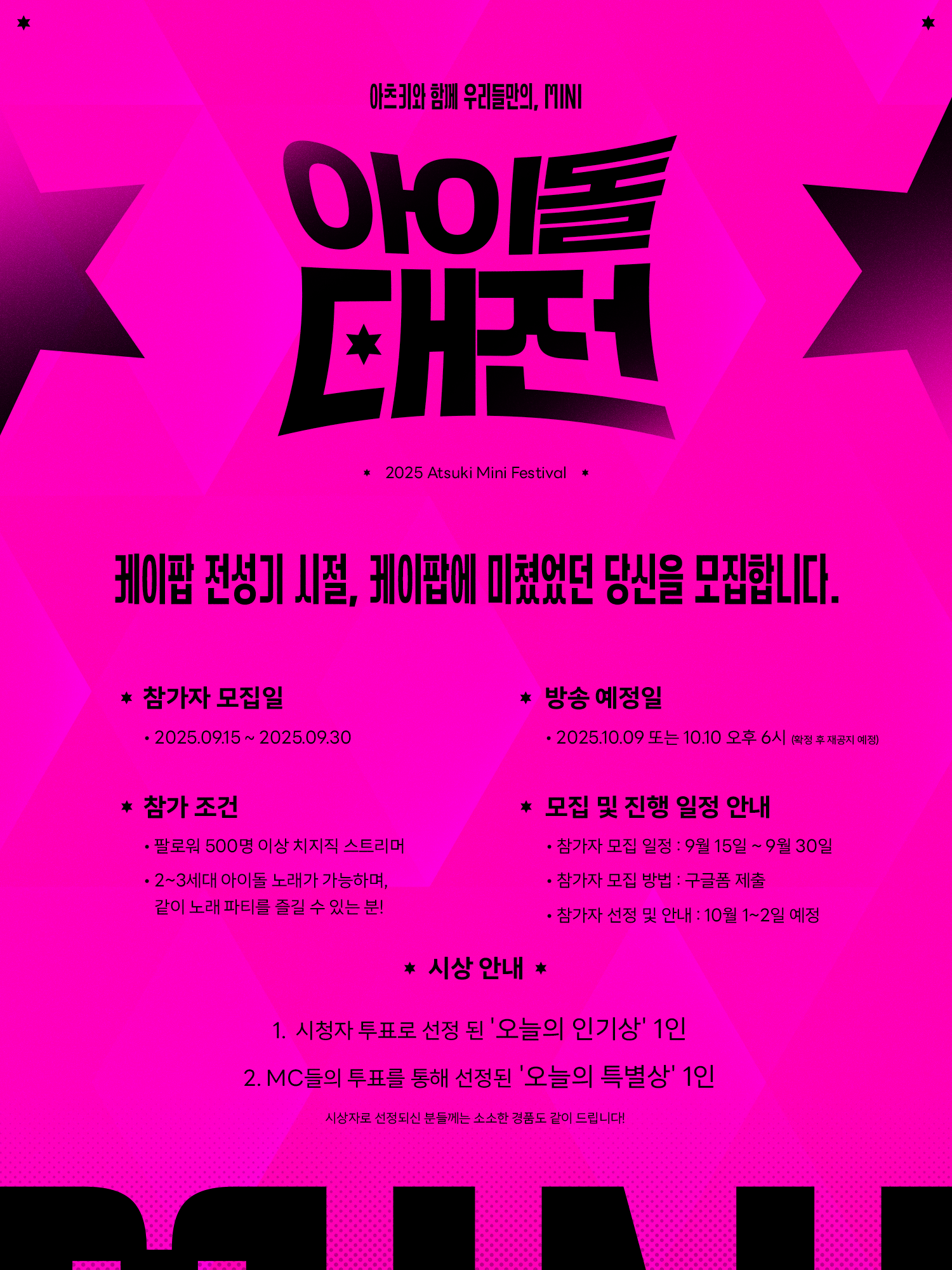 "아츠키와 함께 우리들만의 mini 아이돌대전" 컨텐츠에 함께 해주실 스트리머 분을 찾고 있습니다!