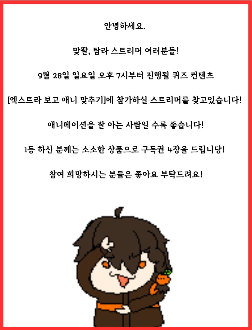 CCS 4번째 퀴즈쇼 [엑스트라 보고 애니 맞추기]애 참여 하실 스트리머 모집!정정라봉신청하러 가기CCS 4번째 퀴즈쇼 [엑스트라 보고 애니 맞추기]애 참여 하실 스트리머 모집 중입니다! 다음주 수요일 까지 지원 받습니다!!