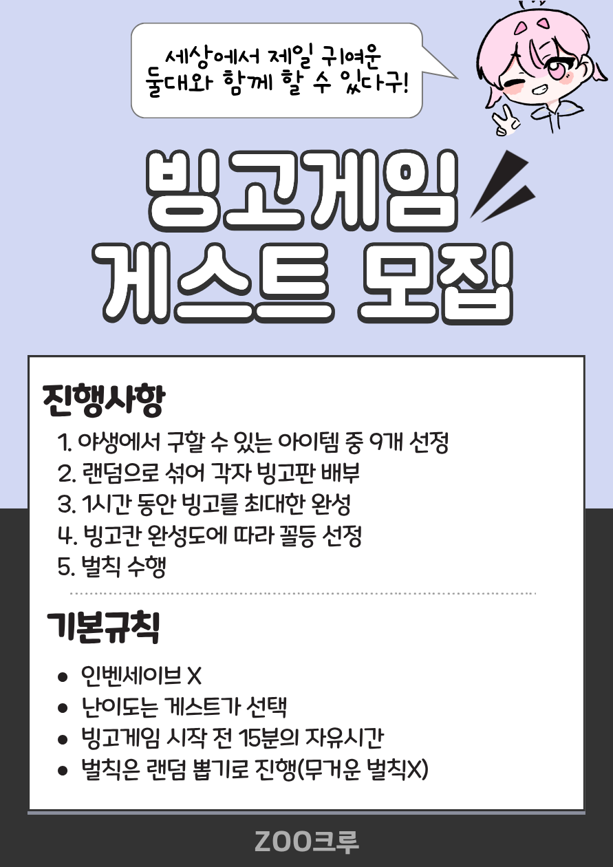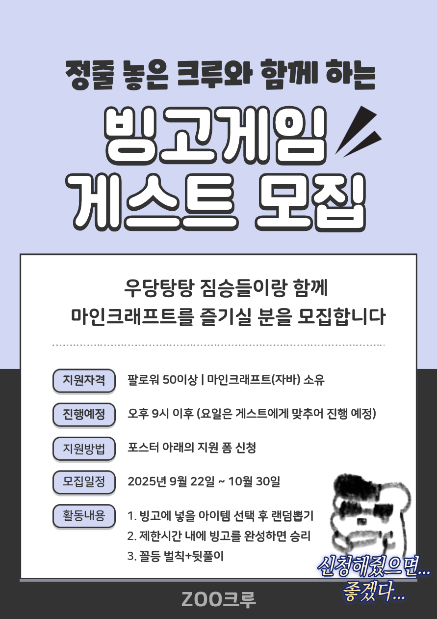 [게스트 모집] 마인크래프트 빙고게임 게스트 모집EEUNTAN신청하러 가기ZOO크루와 함께 마인크래프트에서 빙고게임을 진행할 게스트를 모집합니다! 게임 소요 시간은 2시간 내외이며 필요에 따라 더 길어질 수도 있습니다~궁금하신 점이나 문의는 디스코드 euntan_1 로 주시기 바랍니다!+덧붙입니다~ 영감을 받았던 '여울'님에게 사전허락을 받아 자체제작한 컨텐츠로, 동의를 구했음을 알립니다!다시 한번 재밌는 컨텐츠를 만들게 허락해주신 여울님과 개발자 분에게 감사를 전합니다~