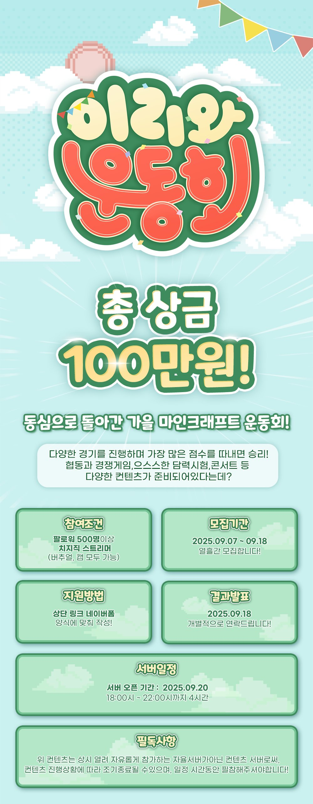 치지직 가을 운동회 [이리와 운동회] 컨텐츠를 열게 되었습니다. 이 컨텐츠는 치지직 제작지원을 받아 제작되었습니다. 모집 안내 대상 : 팔로워 500명 이상의 치지직 스트리머 누구나 선발 인원 : 8명 신청 폼 : https://naver.me/xNnpZxlp 신청 기간 : 2025. 09. 07 ~ 2025. 09. 18 참가자 발표 : 9월 19일 (금) 치지직 커뮤니티 및 개별연락 상금안내 : 총 100만원 1등 : 50만원 2등 : 30만원 3등 : 15만원 시청자 참여상 : 1등을 맞춘 시청자 5명에게 햄버거 기프티콘 전달 문의 : eeeriwolf@gmail.com 치지직 제작지원과 함께하기에 각종 배너,태그 혜택들도 함께하고있습니다! 후원 api도 존재하니 많은 관심과 뻐꾸기 부탁드립니다~