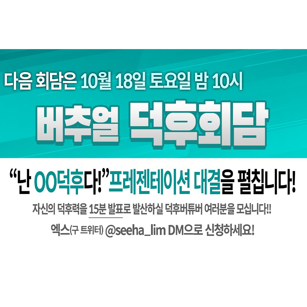 채널시하 버추얼 회담 시리즈에서는 버튜버 여러분의 참여를 기다리고 있습니다! 10월 18일 개최 예정인 [버추얼 덕후회담] 에 출연하실 분들은 본인이 덕질하고 있는 분야를 소개할 수 있는 15분 분량의 발표자료(JPG/PNG)를 준비하셔야 합니다. 출연을 원하신 분은 10월 1일까지 개인 DM으로 신청 바랍니다. 신청자가 많을 경우, 조기마감 없이 심사, 추첨으로 출연자를 정합니다! 그리고 그 이후에 진행될 다양한 주제의 회담도 예약받고 있으니 많이 신청해주세요!!