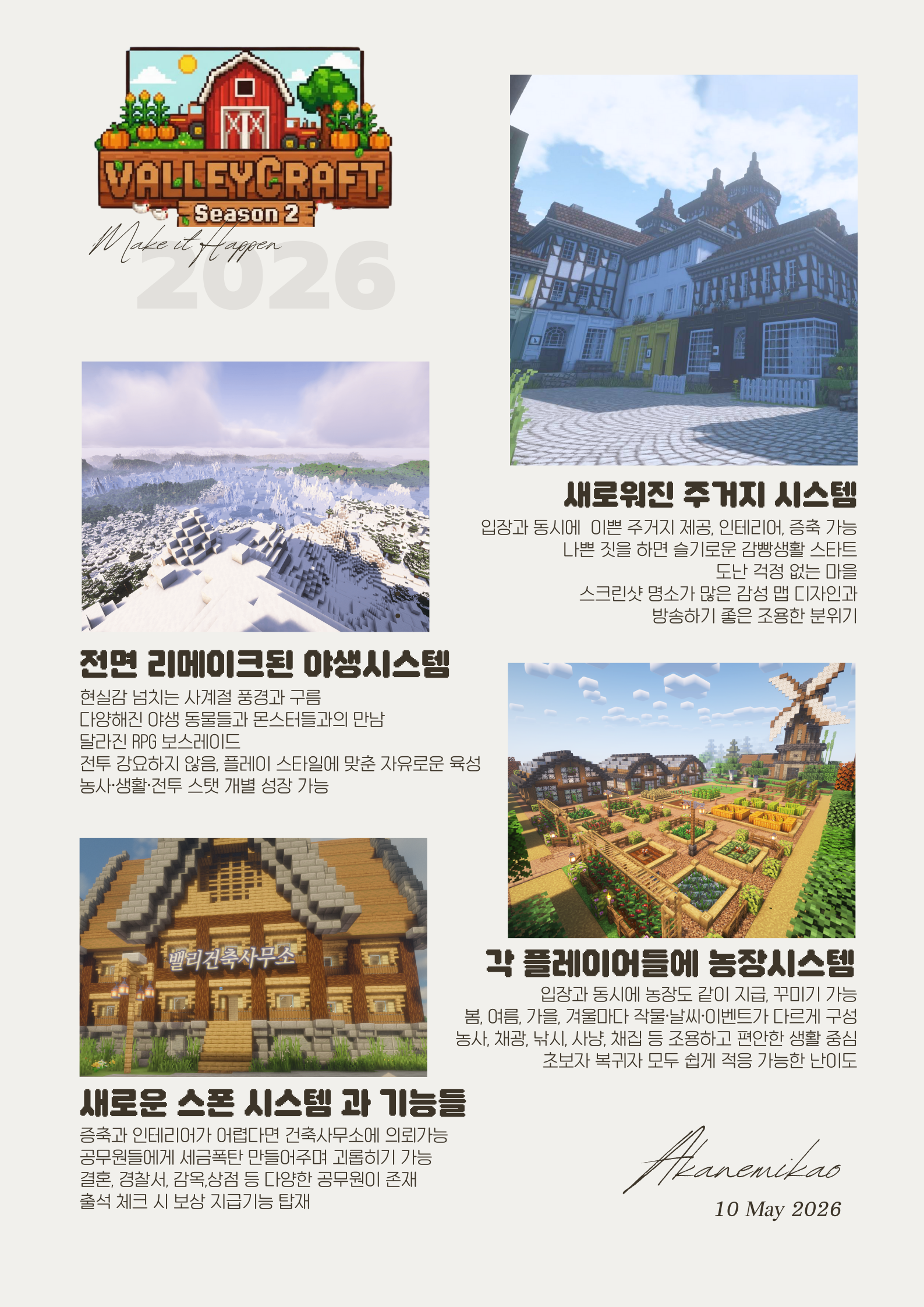 밸리크래프트 시즌2 : 함께한 365일, 다시 시작되는 초장기 스트리머서버아아카네미카오신청하러 가기우리가 함께 만든 365일의 이야기.이제, 새로운 계절이 다시 시작됩니다.더 넓어진 밸리,새로운 성장의 길.그리고… 시즌1에서 이어지는 1년지기의 유산.2025, 밸리크래프트는 다시 한 번 움직입니다.당신의 모험은 아직 끝나지 않았습니다.
