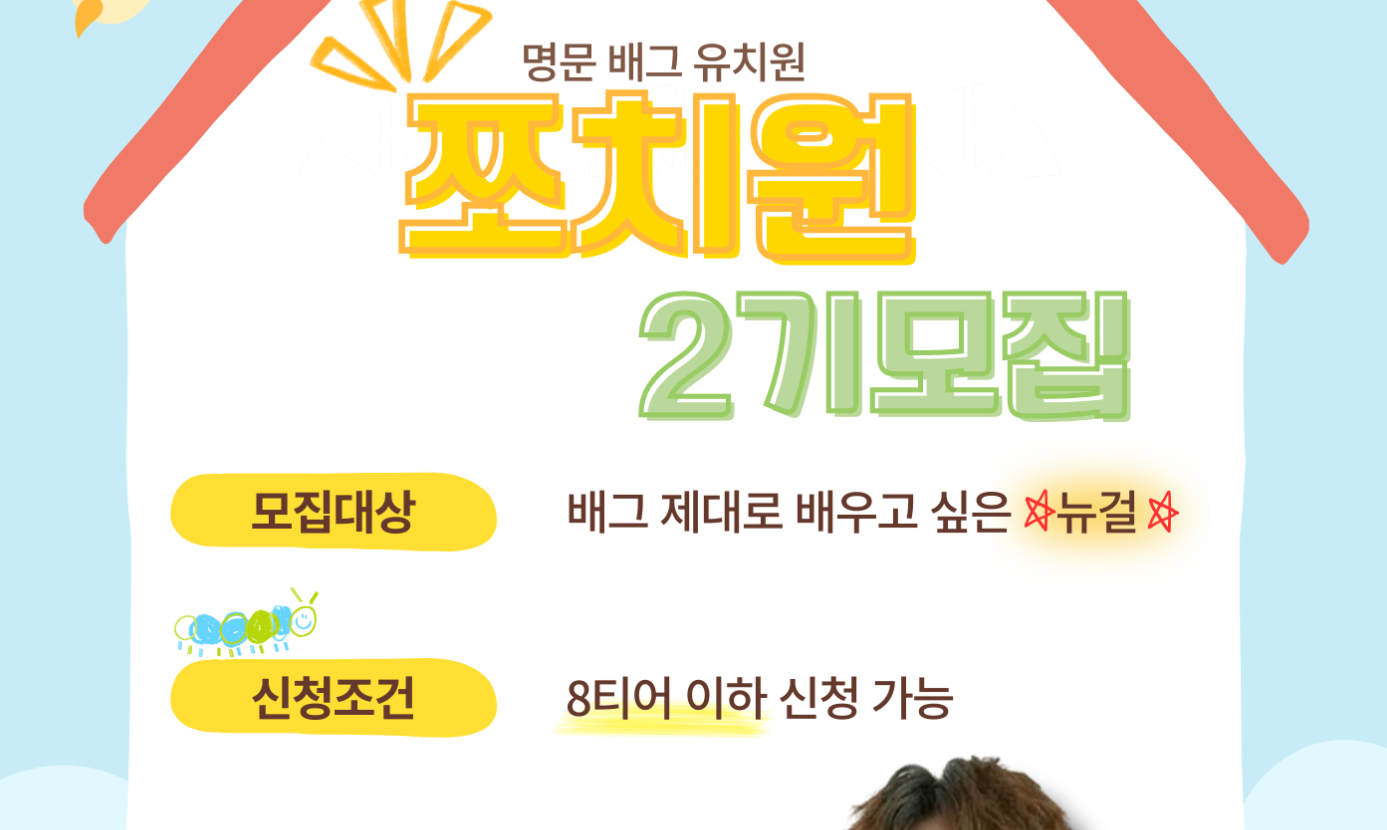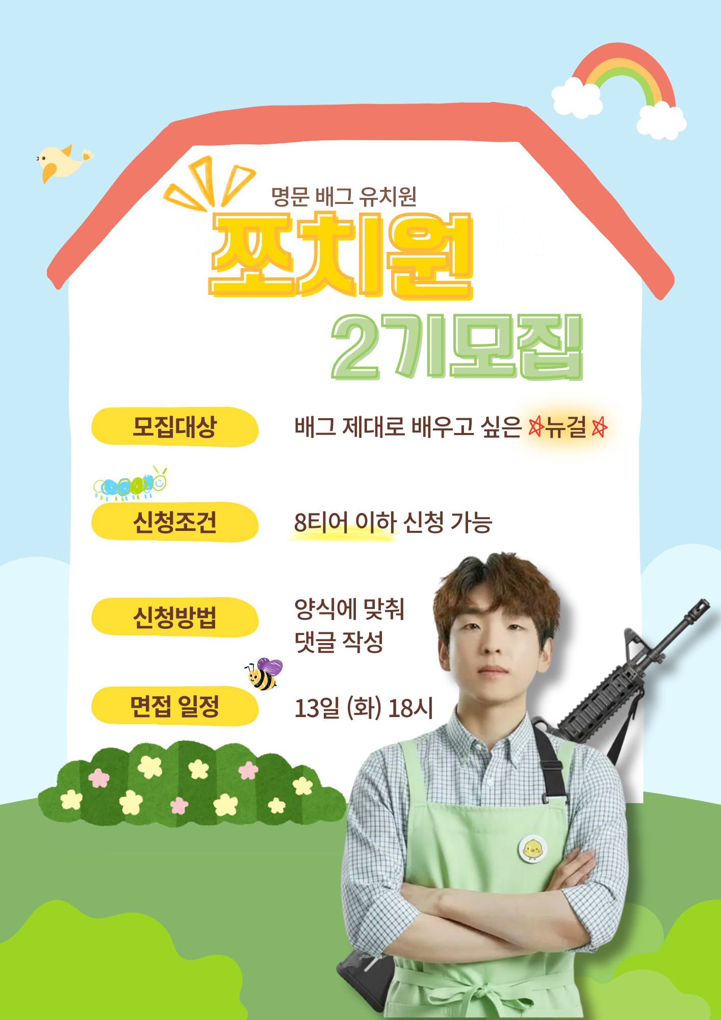 쪼치원 2기 원생모집쪼쪼이.신청하러 가기 뉴걸기준 : 저한테 제대로 배운적 없으신분 신청양식숲 아이디 / 목표 / 플레이타임 / 클립(없으면 안해두됩니다)EX) 쪼이 / 교전의 신 / 10000시간 모집기간 1.12일 00시(상황봐서 늘리거나 줄이도록 하겠습니다) 면접 있습니다크루 있으신분들 허락 받고 오셔야 합니다 면접일정 : 13일 오후6시합격조건 : 줴줴이야 클랜 가입