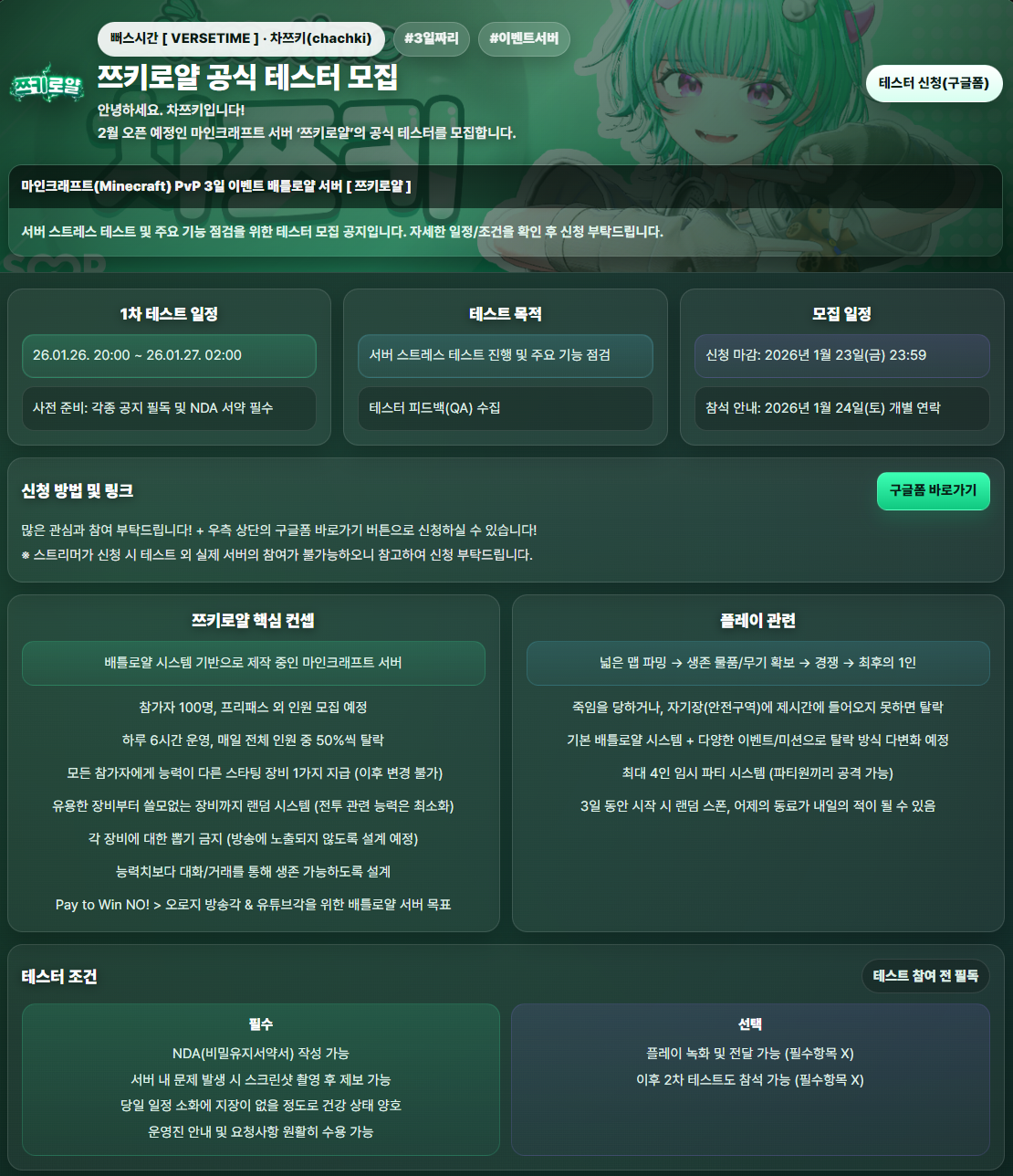 쯔키로얄 1차 테스트 테스터 모집 (1/23마감, 1/24 안내)차차쯔키신청하러 가기https://docs.google.com/forms/d/e/1FAIpQLSfFGBh8fm9p8rIynjLZIPzB5e8A7bXNbLy6JYgE2AtVqKkdCA/viewform