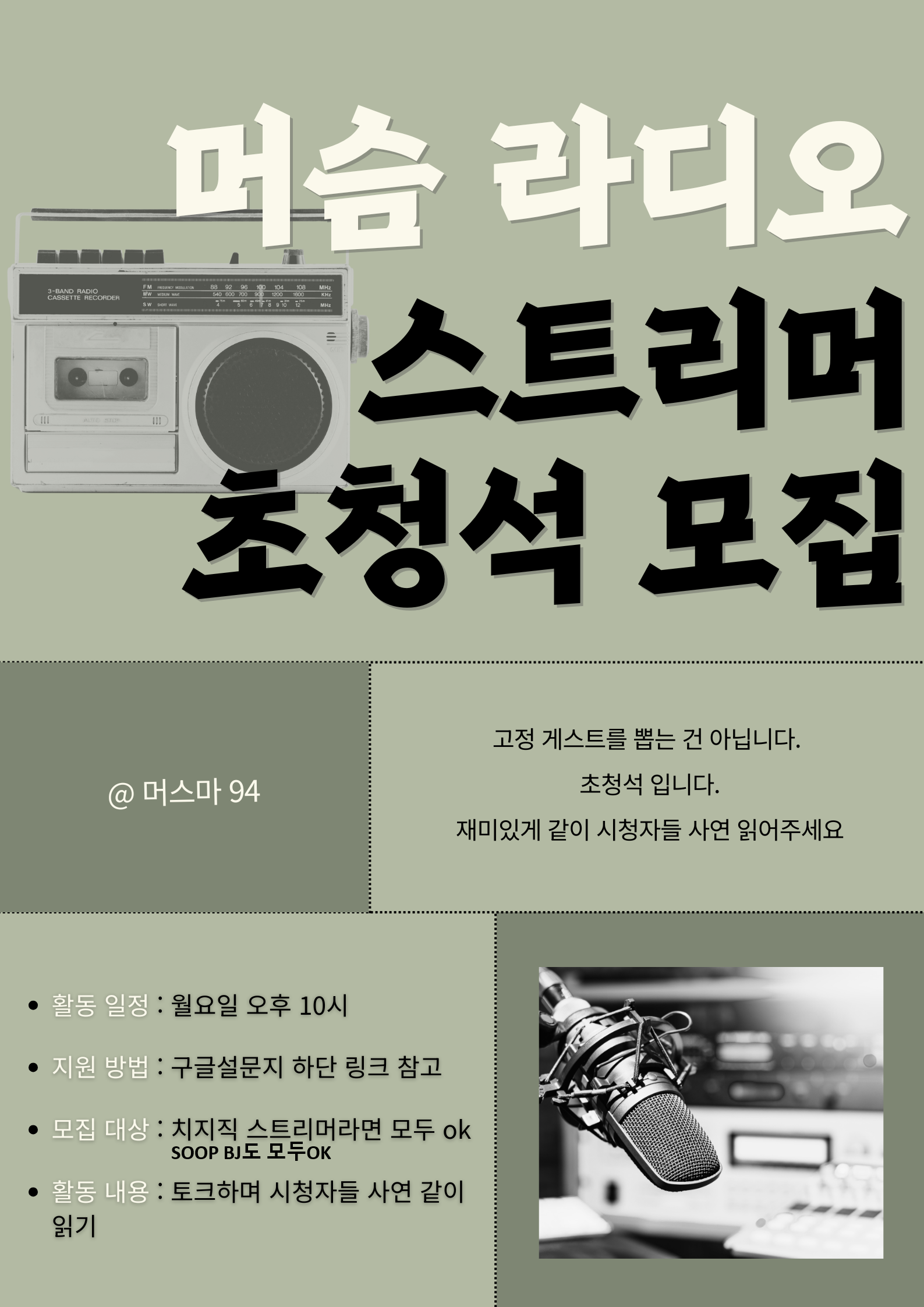 매주 월요일 밤 10시 진행되는 머슴라디오 초대석 스트리머 모집합니다.