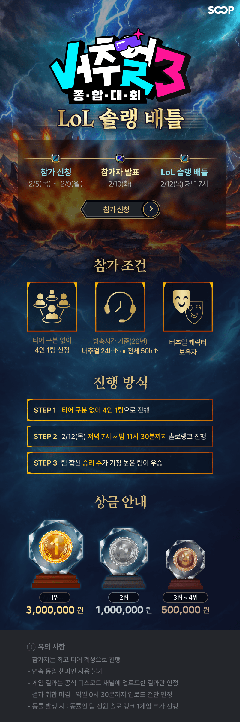 - 2/12(목) 저녁 7시부터 밤 11시 30분까지 참가자 전원 솔로랭크를 진행합니다.