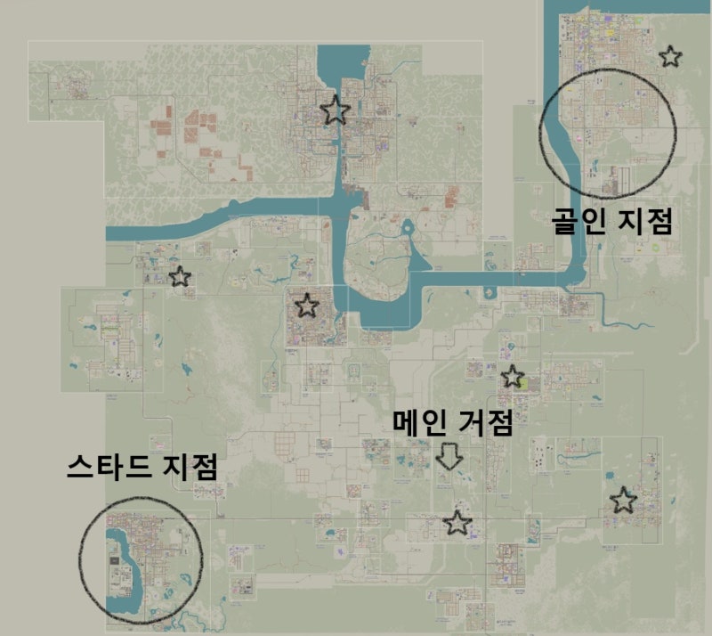 아래 사진처럼 저희는 스타트 지점 (레이븐 크릭)에서 다 같이 리스폰하여 최종적으로 골인 지점 (루이빌)로 향하게 될 거고 5일간 지낼 중앙 메인 거점에 은신처를 건축하여 생존할 예정입니다