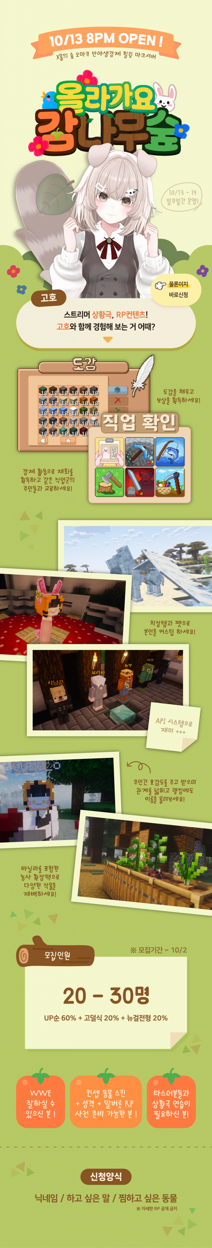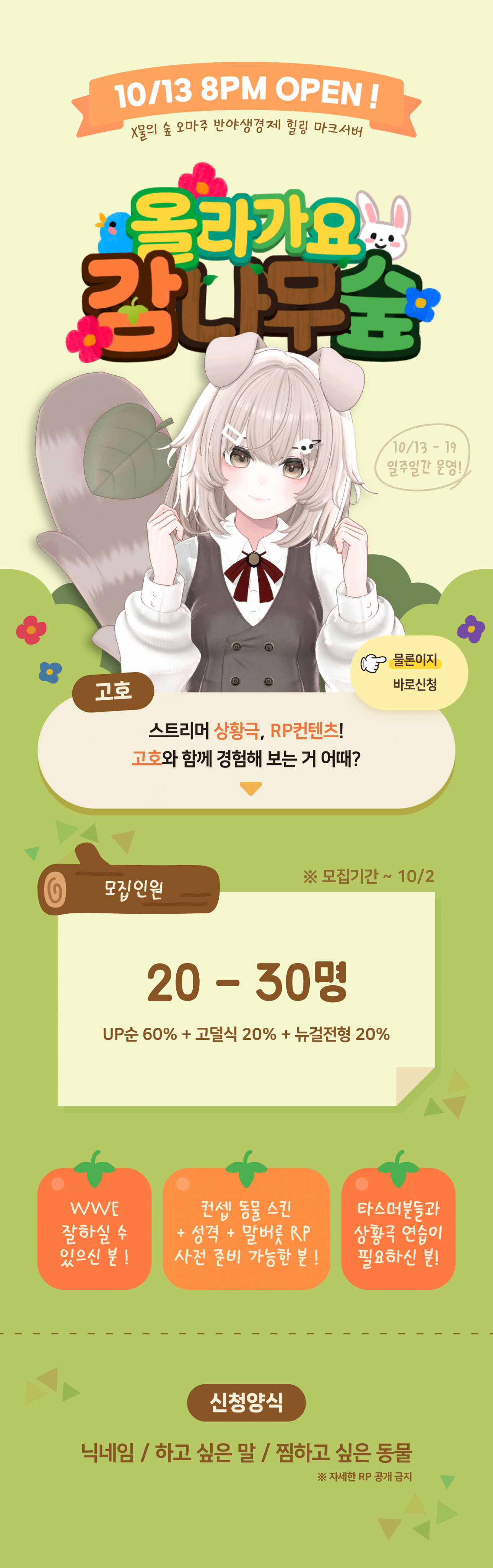 🐶 감나무 숲 인원모집 🐶고고호.신청하러 가기시청자 댓글 블랙하겠습니다! 아래 서버 포스터 먼저 보고 와주세요!🧡감나무숲 🧡 🤎 신청양식 🤎닉네임 / 하고 싶은 말 / 찜하고 싶은 동물 (자세한 rp공개 금지) 🐾 애청자컷 300명 이상 신청 가능!🐾ㄴ 뉴걸 전형 제외!<서버 포스터>